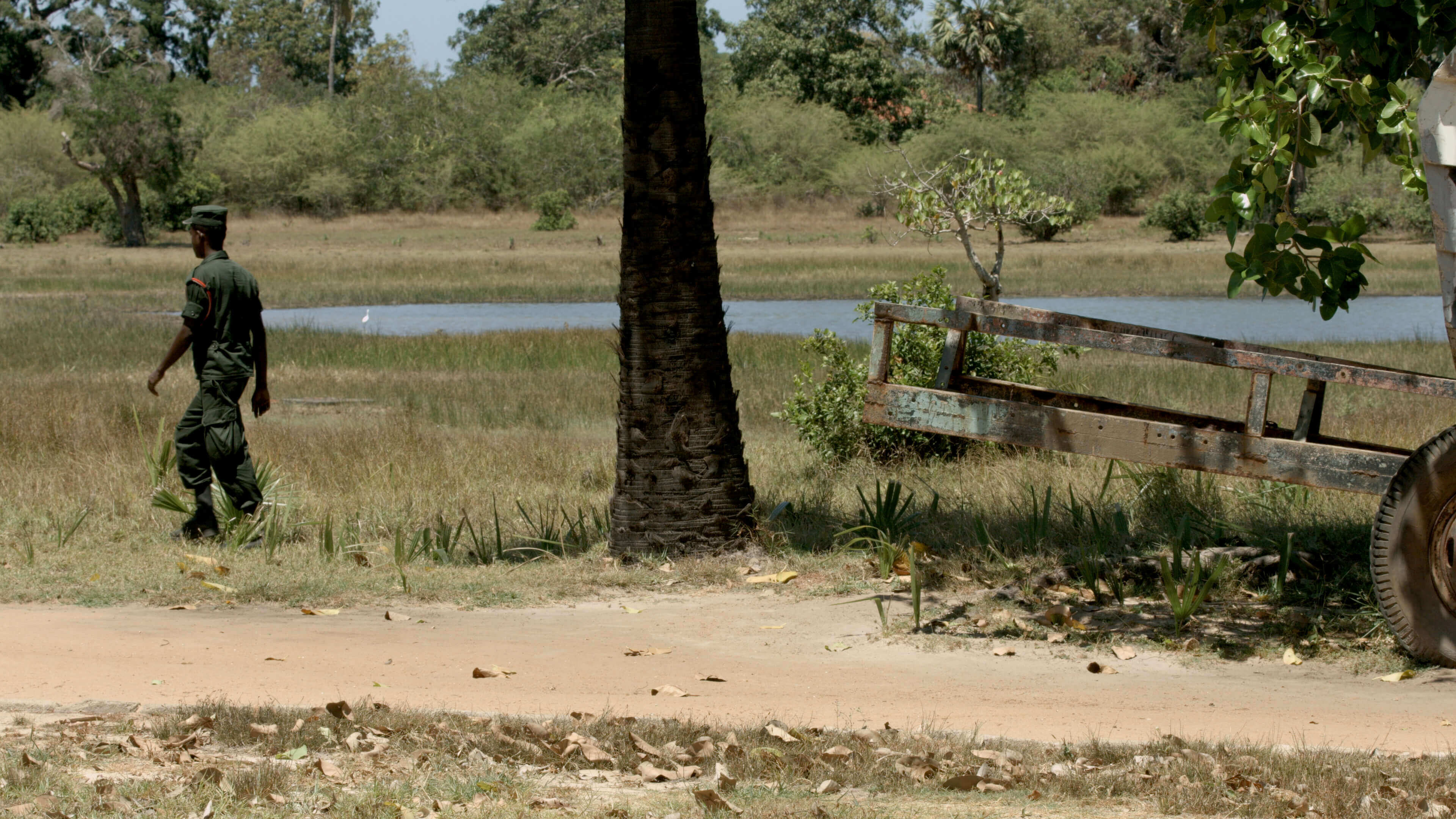 A man with a gun stands in the way. “Where are you going? What are you doing?” he asks.